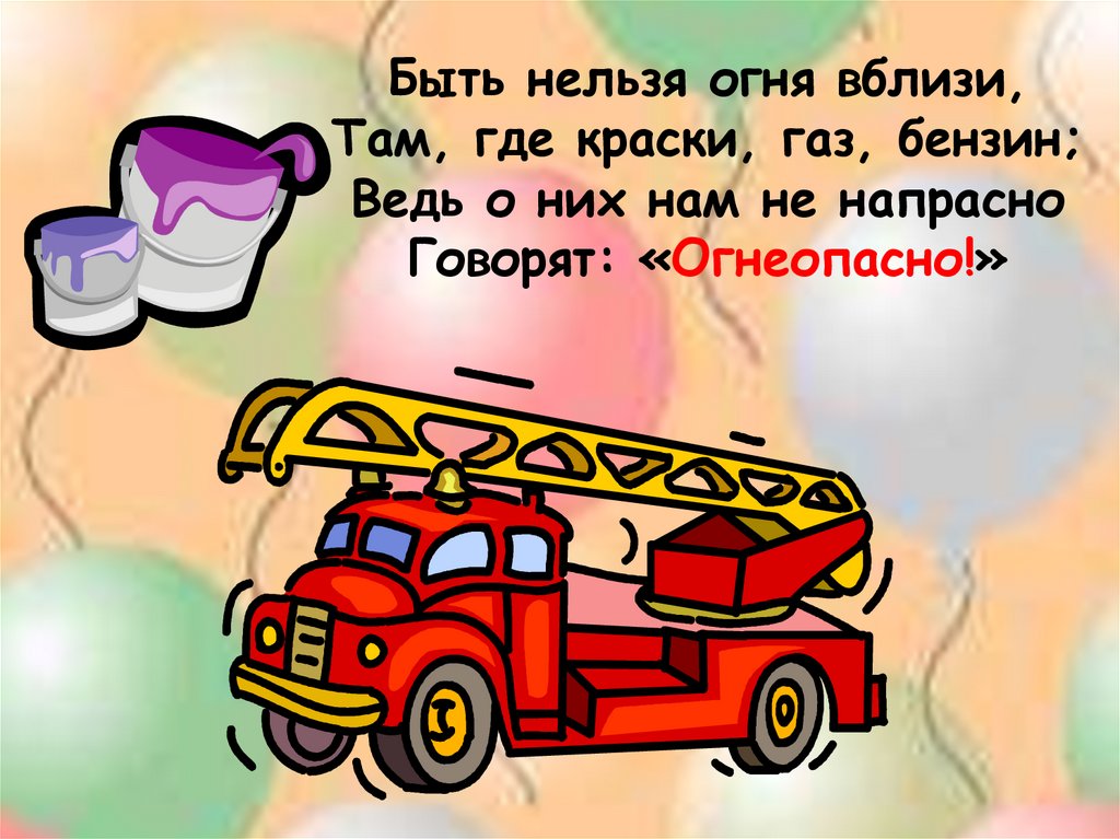 Быть нельзя огня вблизи,Там, где краски, газ, бензин;