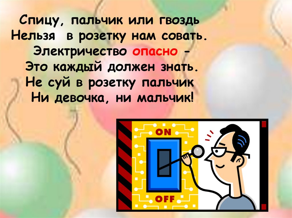 Спицу, пальчик или гвоздьНельзя в розетку нам совать.