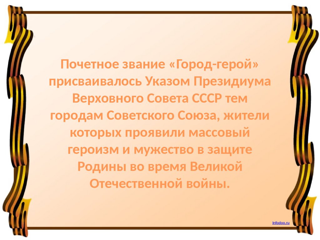 Почетное звание «Город-герой»присваивалось Указом Президиума