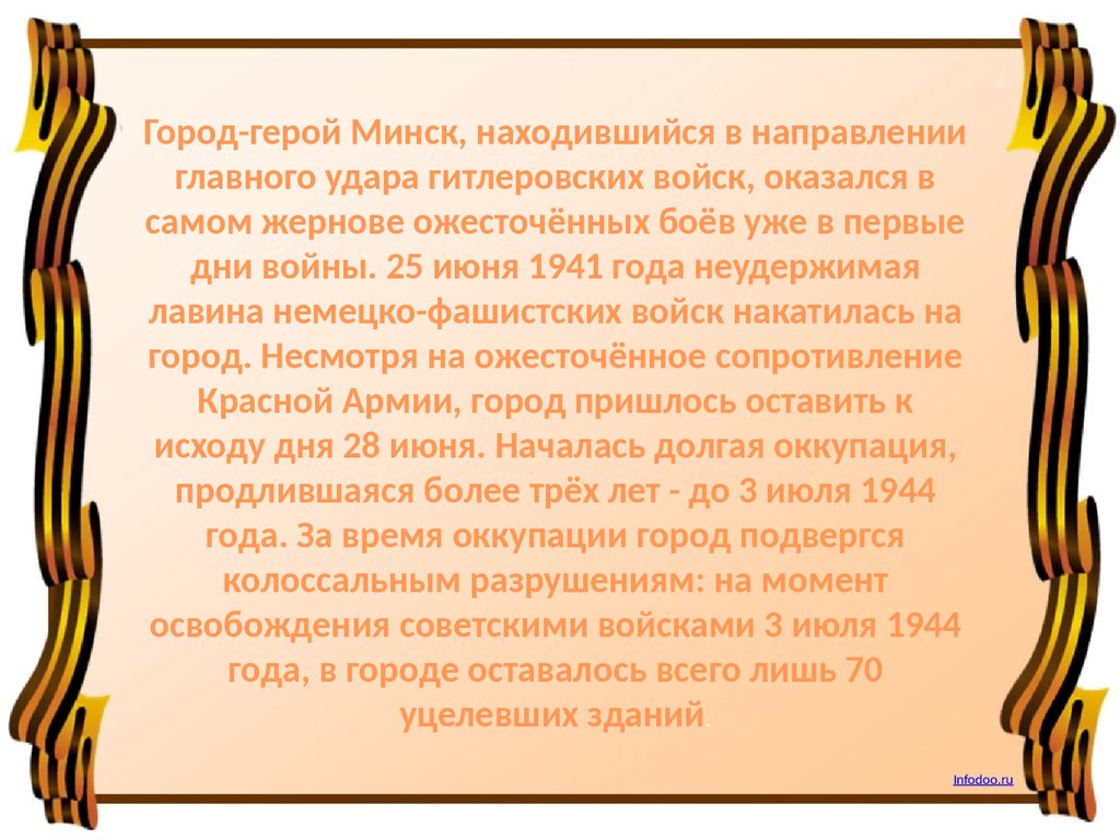 Город-герой Минск, находившийся в направленииглавного удара гитлеровских войск, оказался в