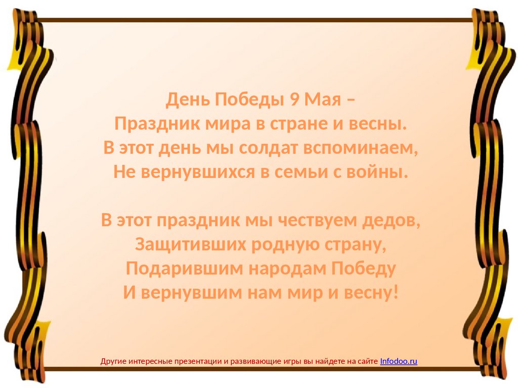 День Победы 9 Мая –Праздник мира в стране и весны.