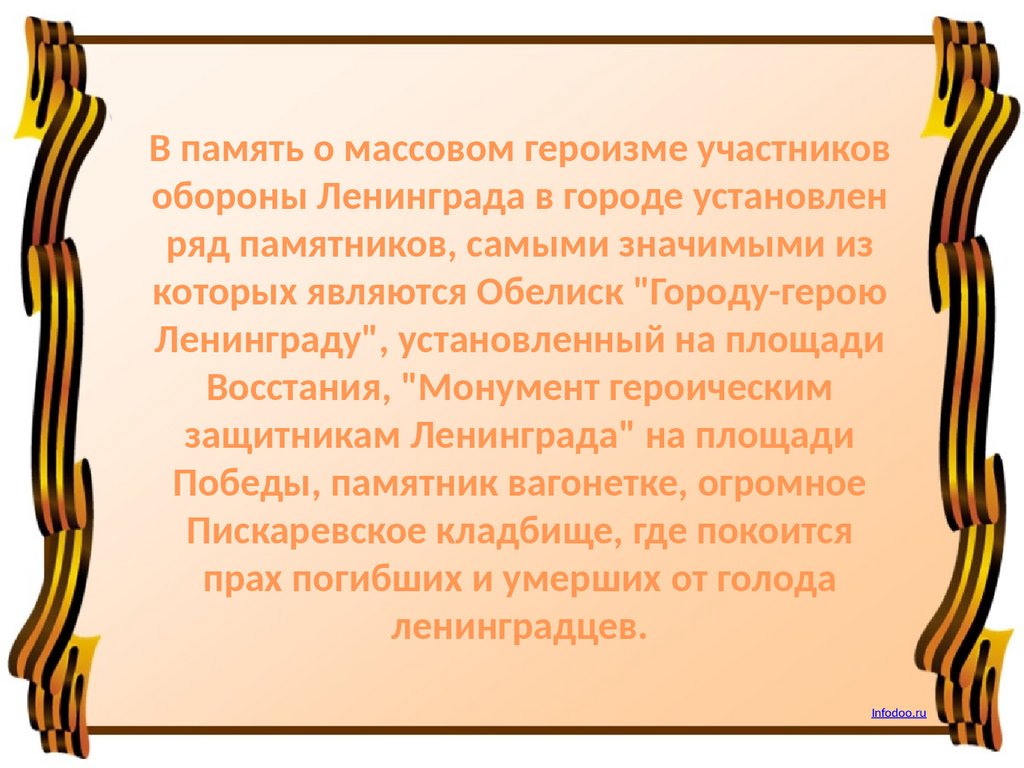 В память о массовом героизме участниковобороны Ленинграда в городе установлен