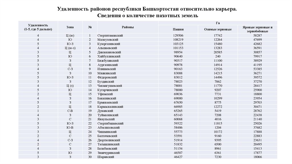 Удаленность районов республики Башкортостан относительно карьера. Сведения о количестве пахотных земель