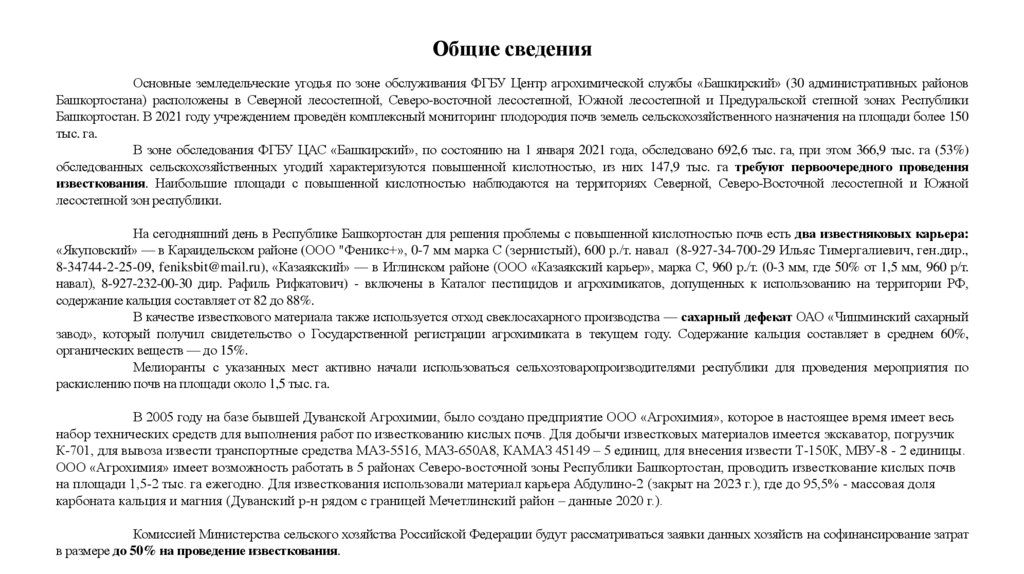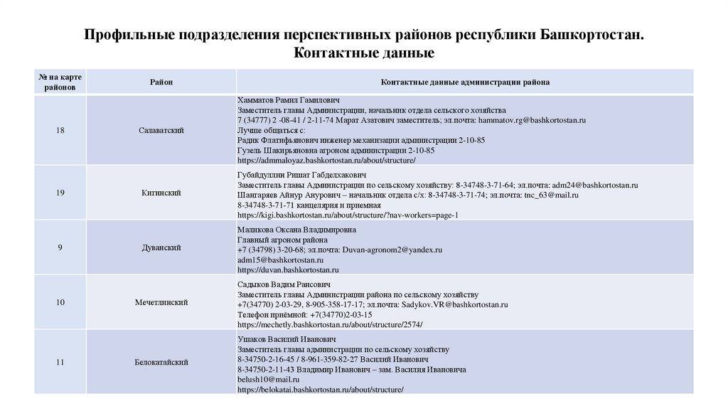 Профильные подразделения перспективных для известкования районов республики Башкортостан. Контактные данные