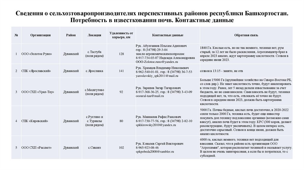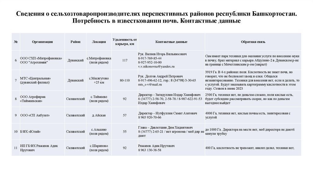 Сведения о сельхозтоваропроизводителях перспективных для известкования районов республики Башкортостан.