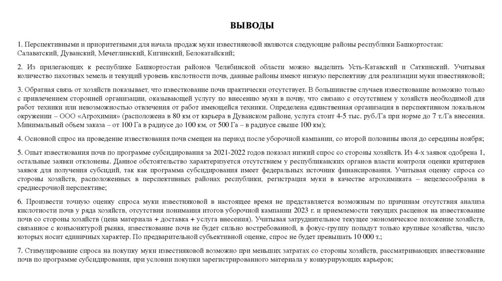 ВЫВОДЫ1. Перспективными и приоритетными для начала продаж муки известняковой являются следующие районы республики Башкортостан: