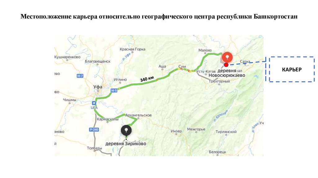 Местоположение карьера относительно географического центра республики БашкортостанКАРЬЕР