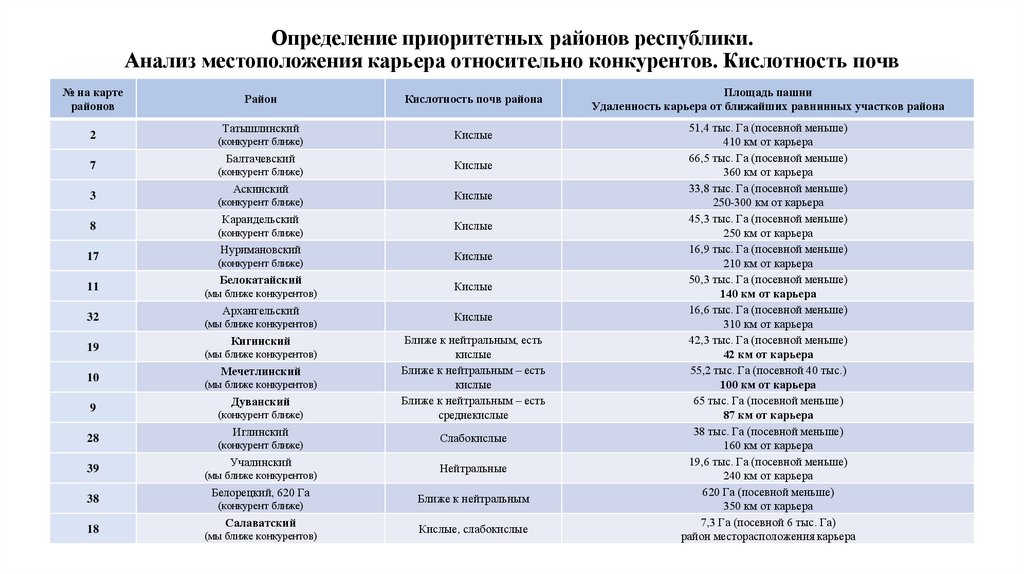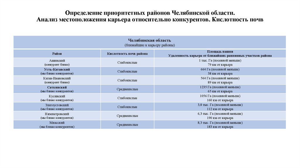 Анализ местоположения карьера относительно конкурентов. Кислотность почв