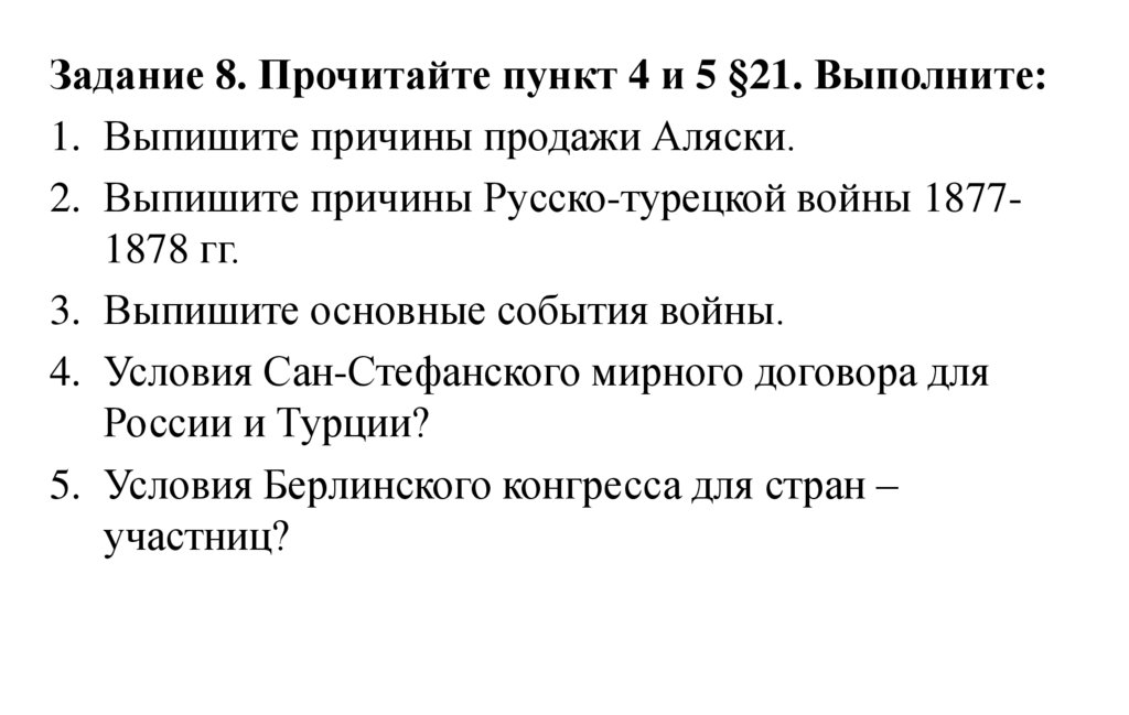 Задание 8. Прочитайте пункт 4 и 5 §21. Выполните:1. Выпишите причины продажи Аляски.