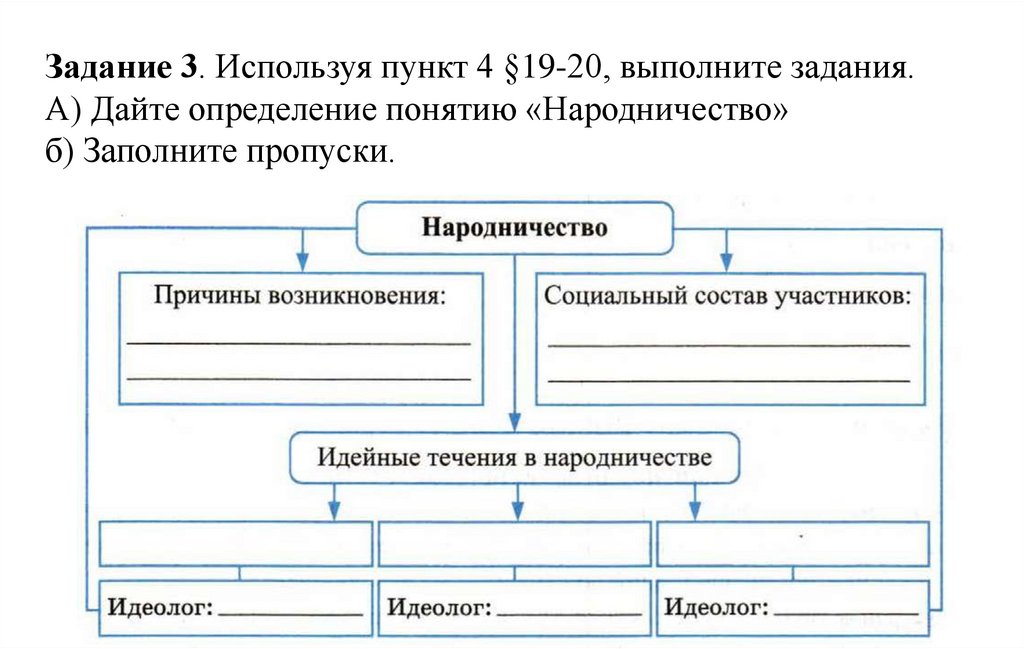Задание 3. Используя пункт 4 §19-20, выполните задания.А) Дайте определение понятию «Народничество»