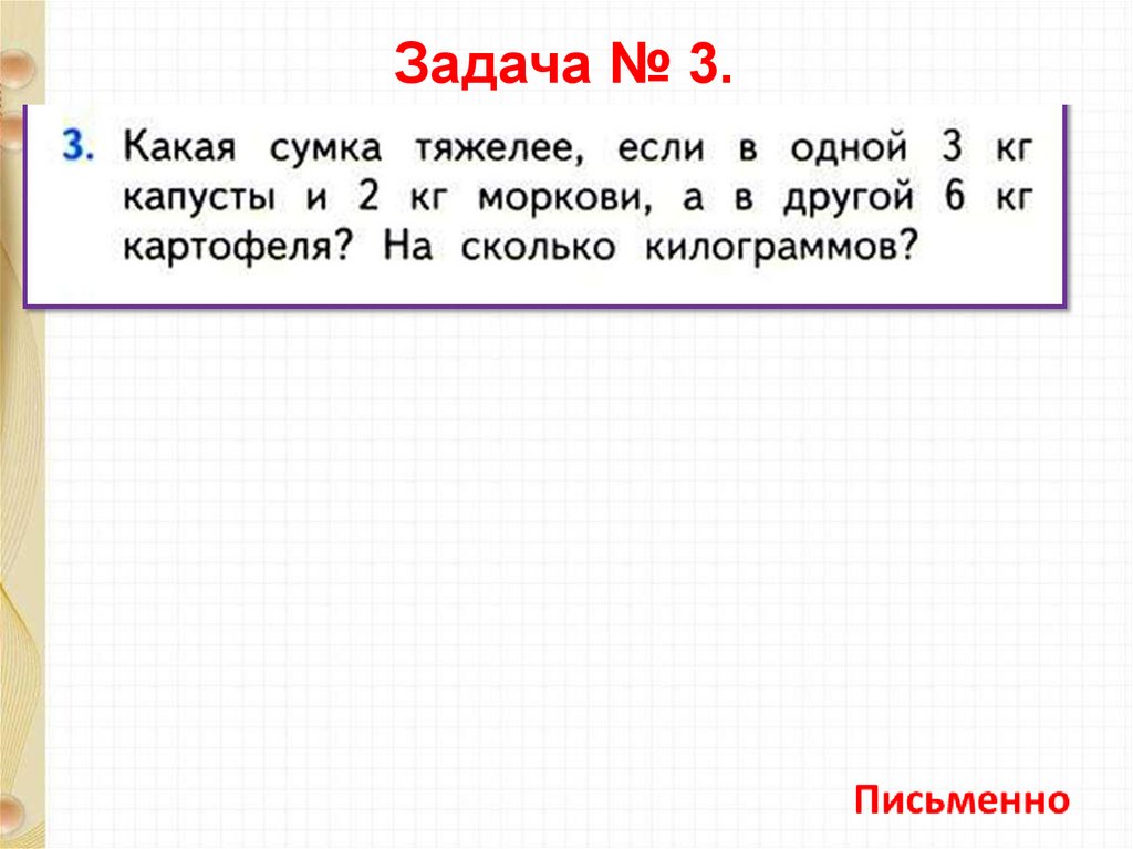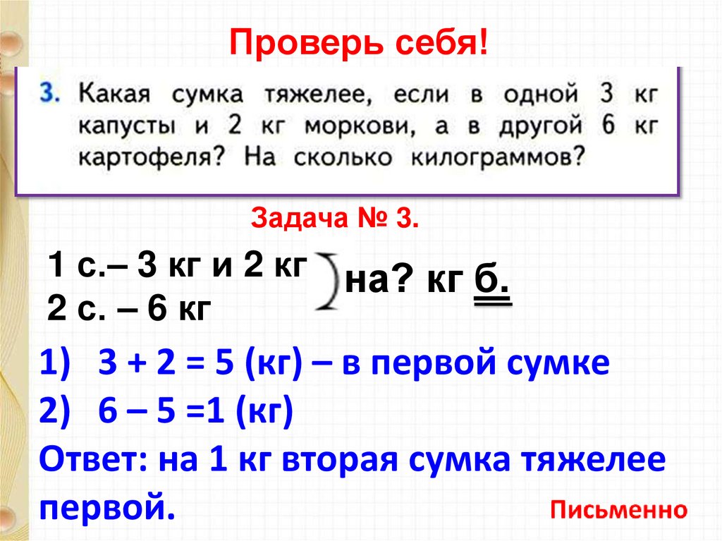 1) 3 + 2 = 5 (кг) – в первой сумке