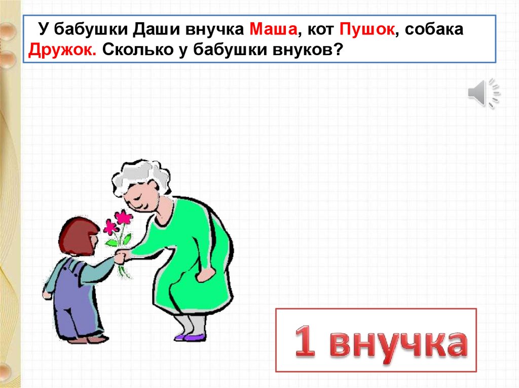 У бабушки Даши внучка Маша, кот Пушок, собакаДружок. Сколько у бабушки внуков?