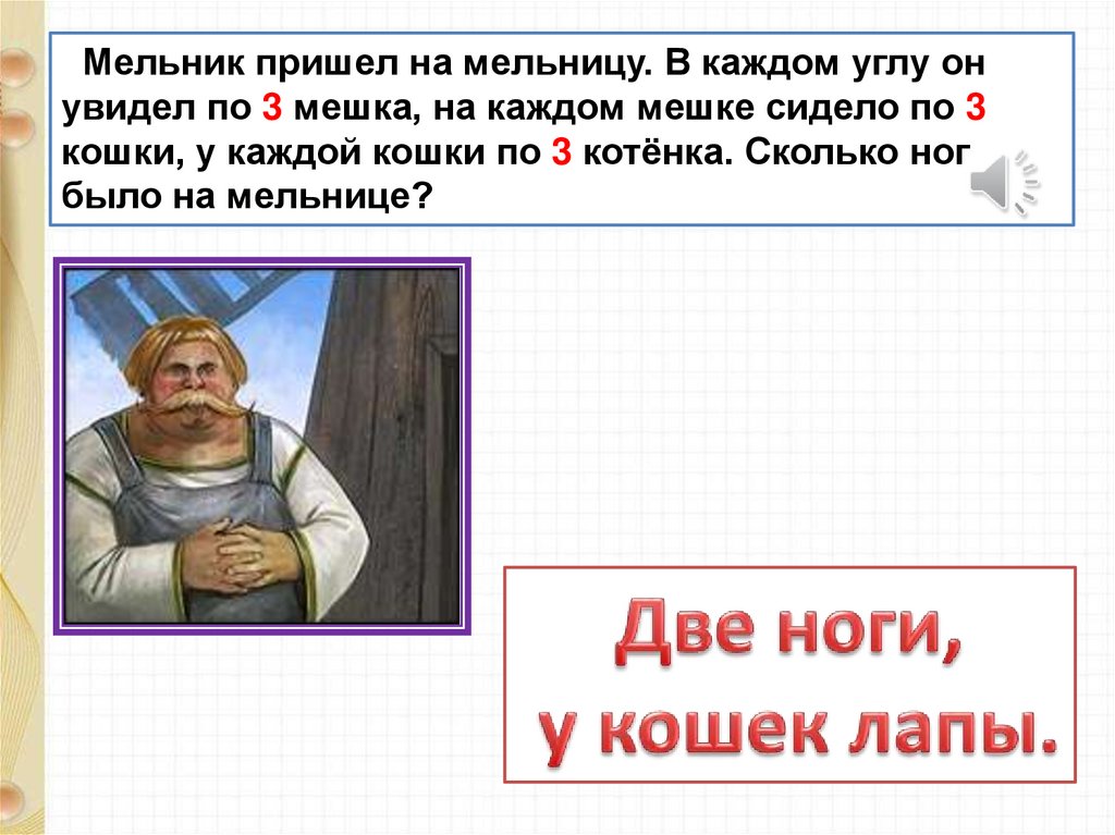 Мельник пришел на мельницу. В каждом углу онувидел по 3 мешка, на каждом мешке сидело по 3