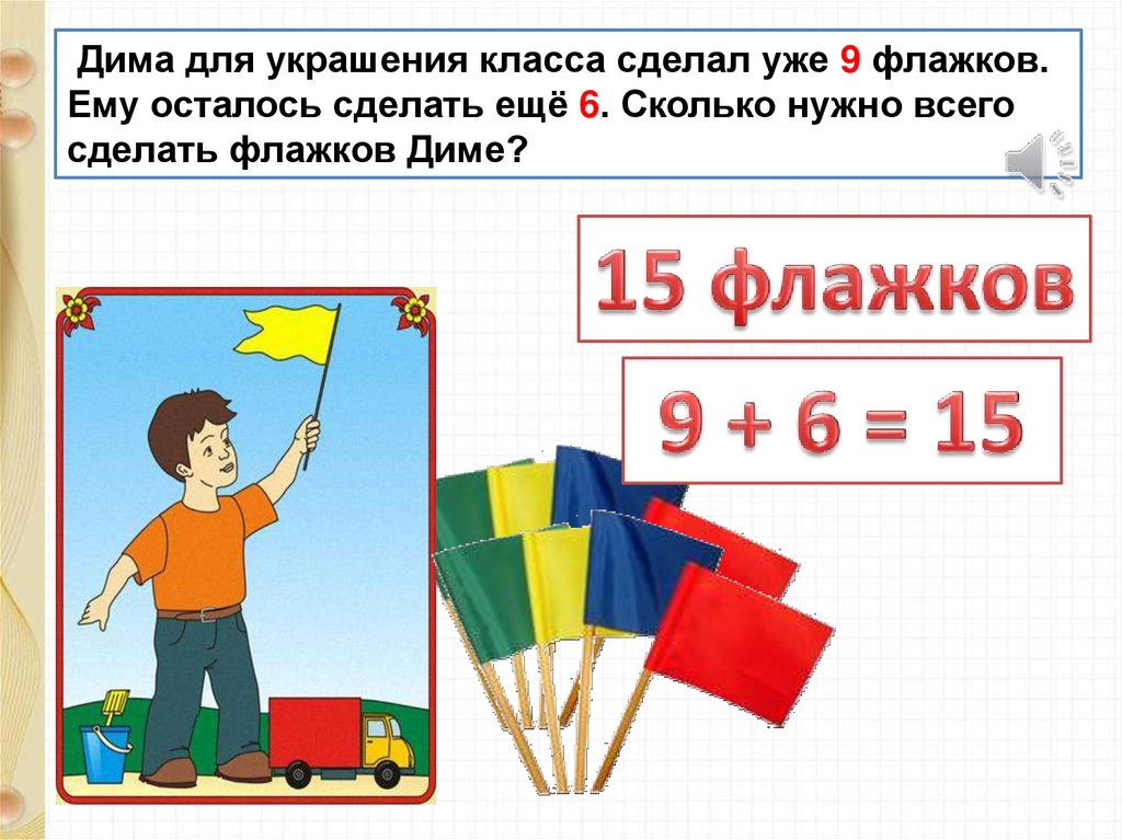 Дима для украшения класса сделал уже 9 флажков.Ему осталось сделать ещё 6. Сколько нужно всего