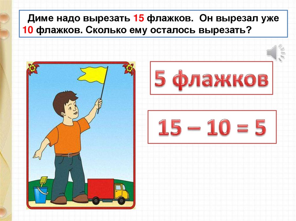 Диме надо вырезать 15 флажков. Он вырезал уже10 флажков. Сколько ему осталось вырезать?