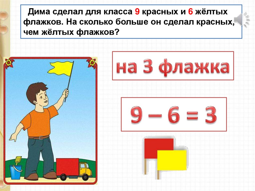 Дима сделал для класса 9 красных и 6 жёлтыхфлажков. На сколько больше он сделал красных,