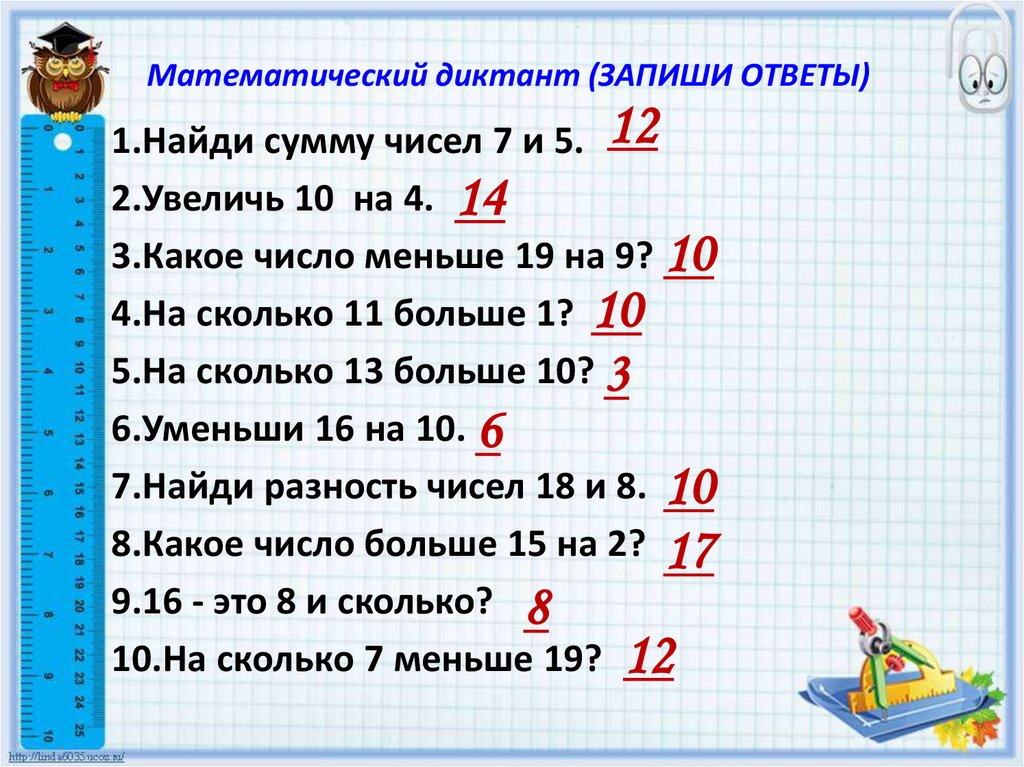 Математический диктант (ЗАПИШИ ОТВЕТЫ)1.Найди сумму чисел 7 и 5. 12