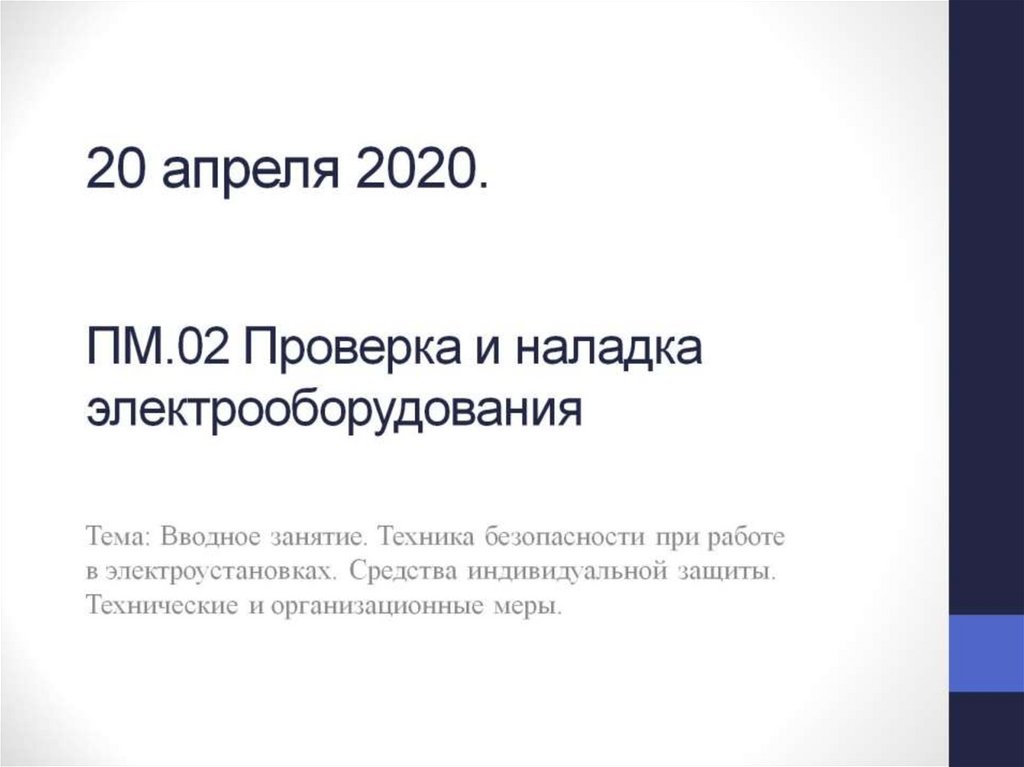 Вводное занятие. Техника безопасности при работе в электроустановках. Средства индивидуальной защиты. Технические меры