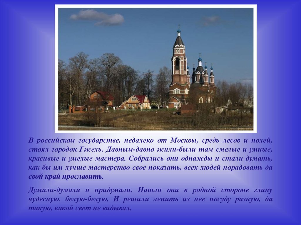 В российском государстве, недалеко от Москвы, средь лесов и полей,стоял городок Гжель. Давным-давно жили-были там смелые и умные,