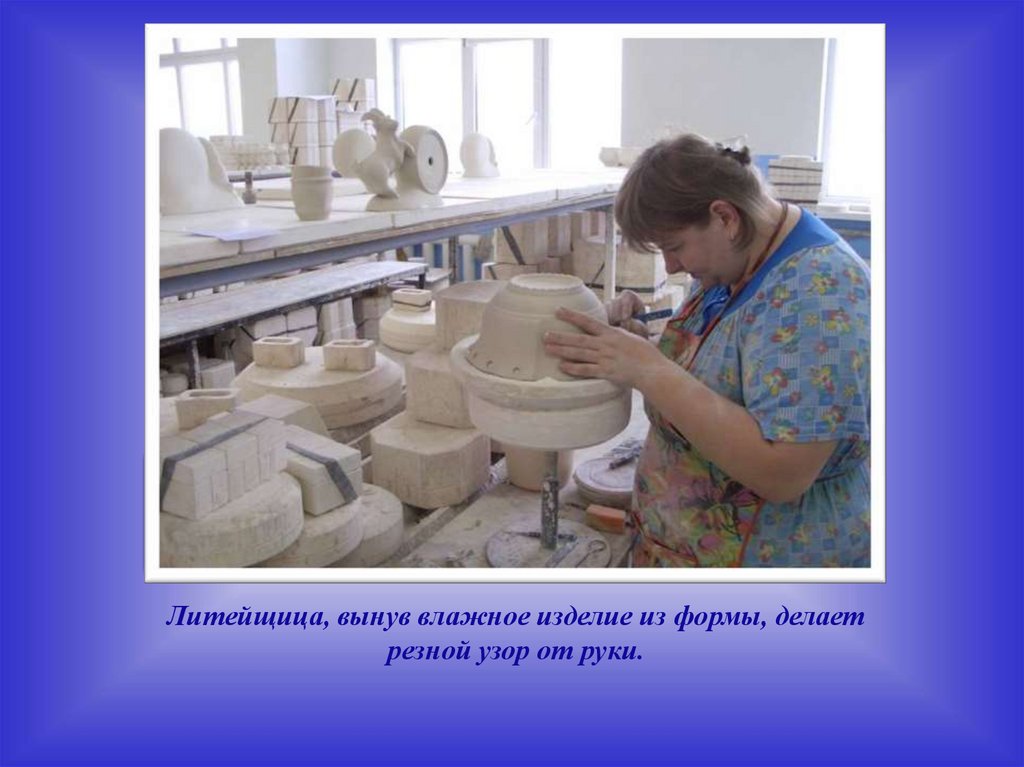 Литейщица, вынув влажное изделие из формы, делаетрезной узор от руки.