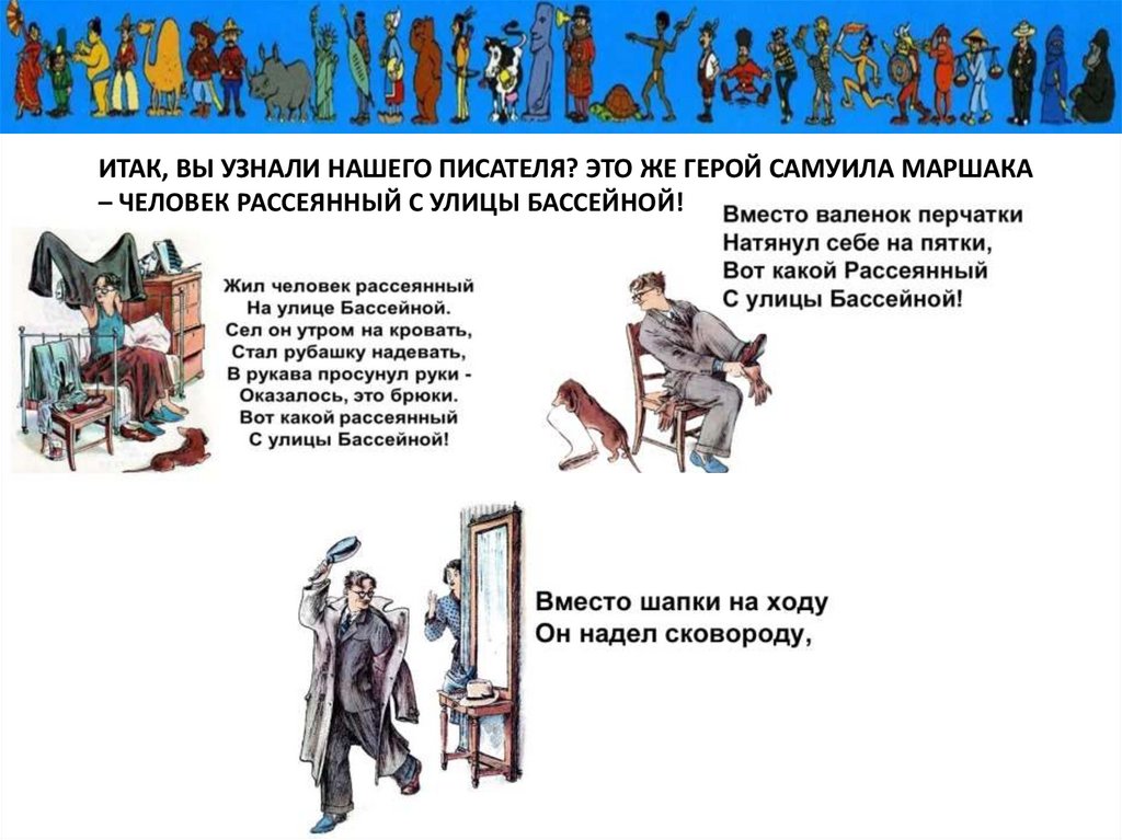 ИТАК, ВЫ УЗНАЛИ НАШЕГО ПИСАТЕЛЯ? ЭТО ЖЕ ГЕРОЙ САМУИЛА МАРШАКА– ЧЕЛОВЕК РАССЕЯННЫЙ С УЛИЦЫ БАССЕЙНОЙ!