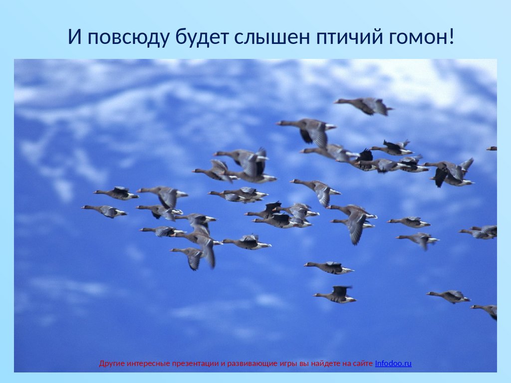 И повсюду будет слышен птичий гомон!Другие интересные презентации и развивающие игры вы найдете на сайте Infodoo.ru