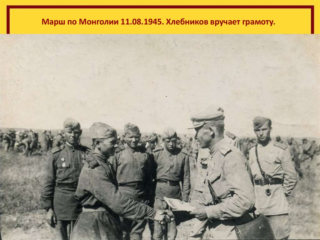 Марш по Монголии 11.08.1945. Хлебников вручает грамоту.11.