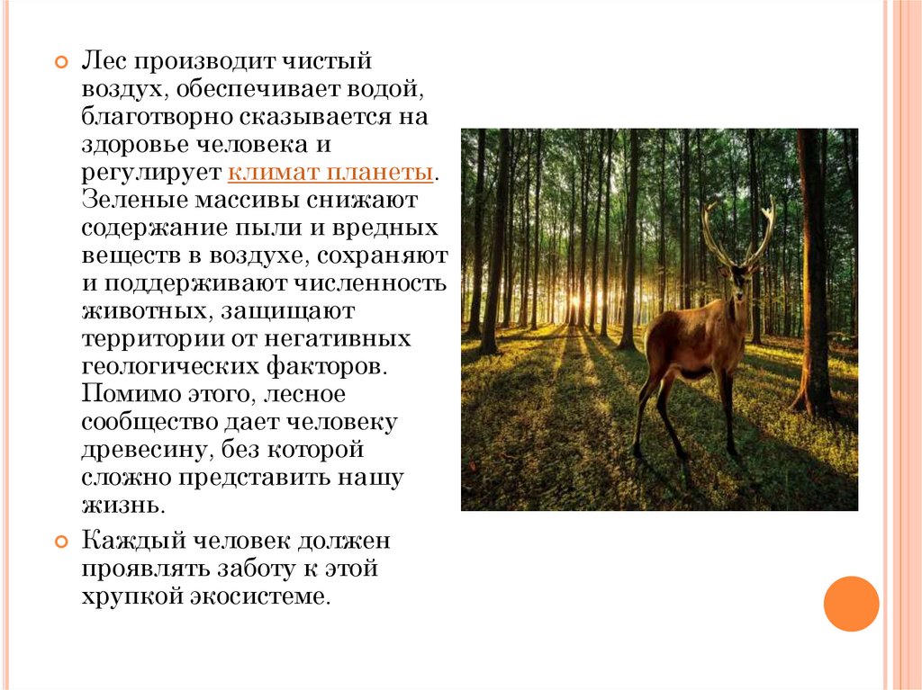 Лес производит чистыйвоздух, обеспечивает водой,