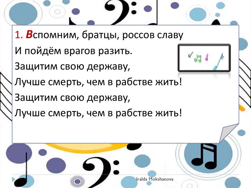 1. Вспомним, братцы, россов славуИ пойдём врагов разить.