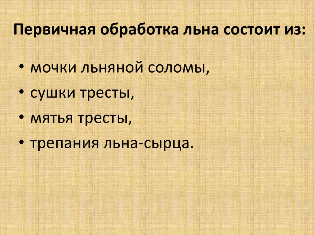 Первичная обработка льна состоит из:мочки льняной соломы,