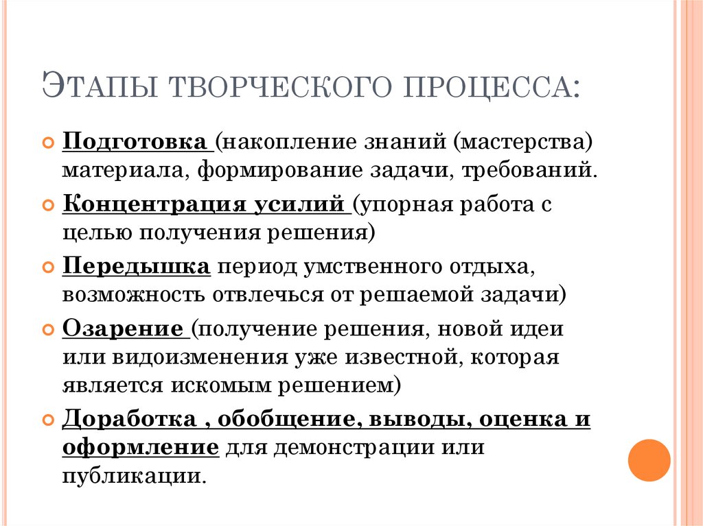 ЭТАПЫ ТВОРЧЕСКОГО ПРОЦЕССА:Подготовка (накопление знаний (мастерства)
