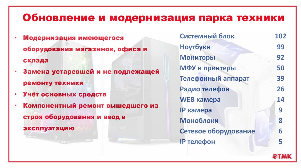 Обновление и модернизация парка техники• Модернизация имеющегося