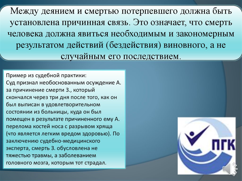 Между деянием и смертью потерпевшего должна бытьустановлена причинная связь. Это означает, что смерть