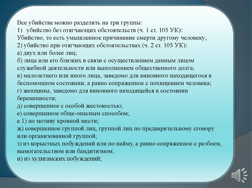 Все убийства можно разделить на три группы:1) убийство без отягчающих обстоятельств (ч. 1 ст. 105 УК):