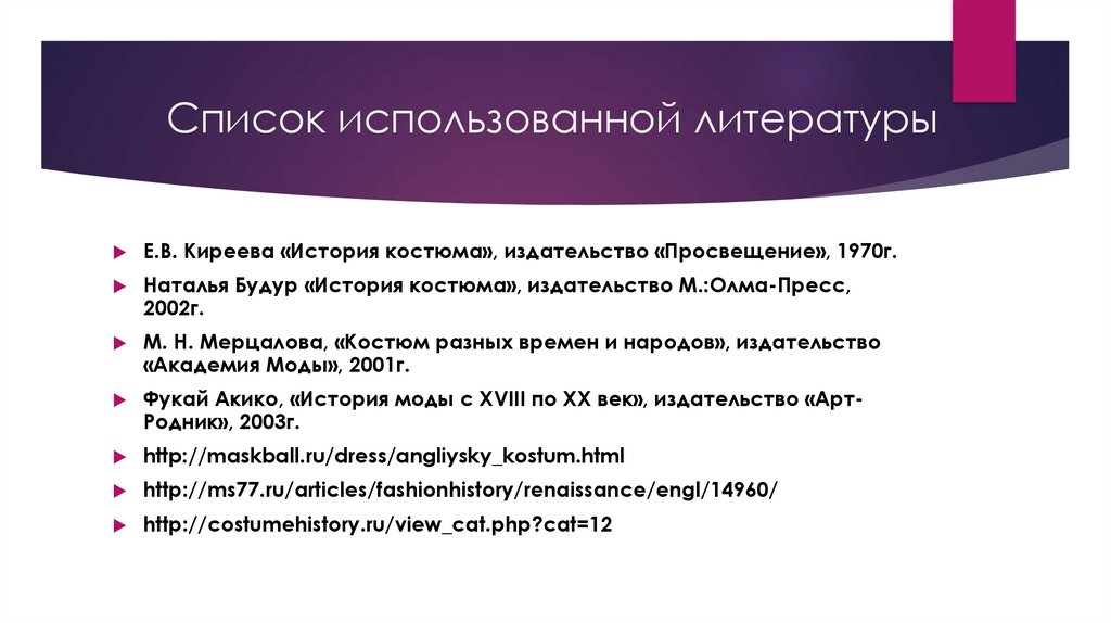 Список использованной литературыЕ.В. Киреева «История костюма», издательство «Просвещение», 1970г.