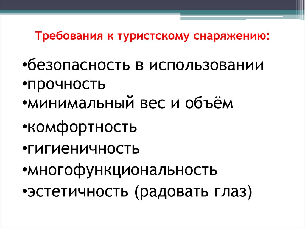 Требования к туристскому снаряжению:•безопасность в использовании