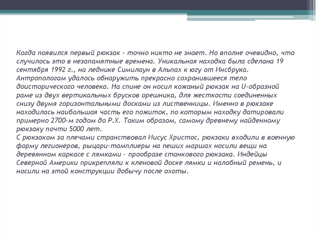Когда появился первый рюкзак - точно никто не знает. Но вполне очевидно, чтослучилось это в незапамятные времена. Уникальная находка была сделана 19