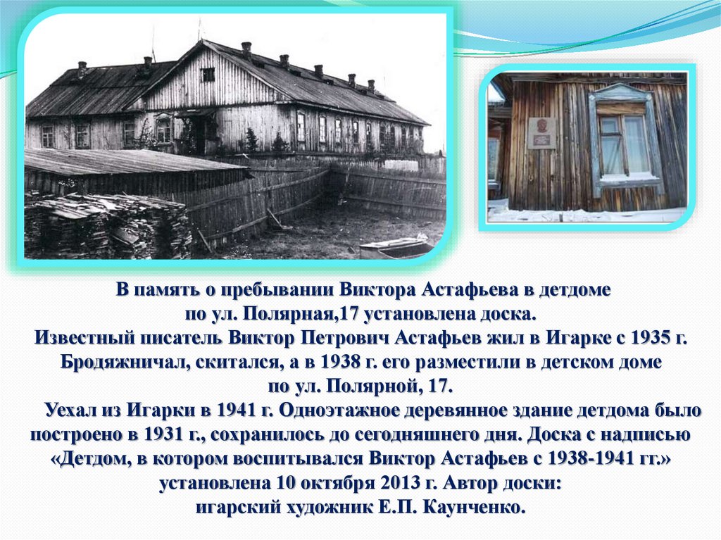 В память о пребывании Виктора Астафьева в детдомепо ул. Полярная,17 установлена доска.