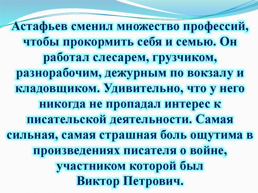 Астафьев сменил множество профессий,чтобы прокормить себя и семью. Он