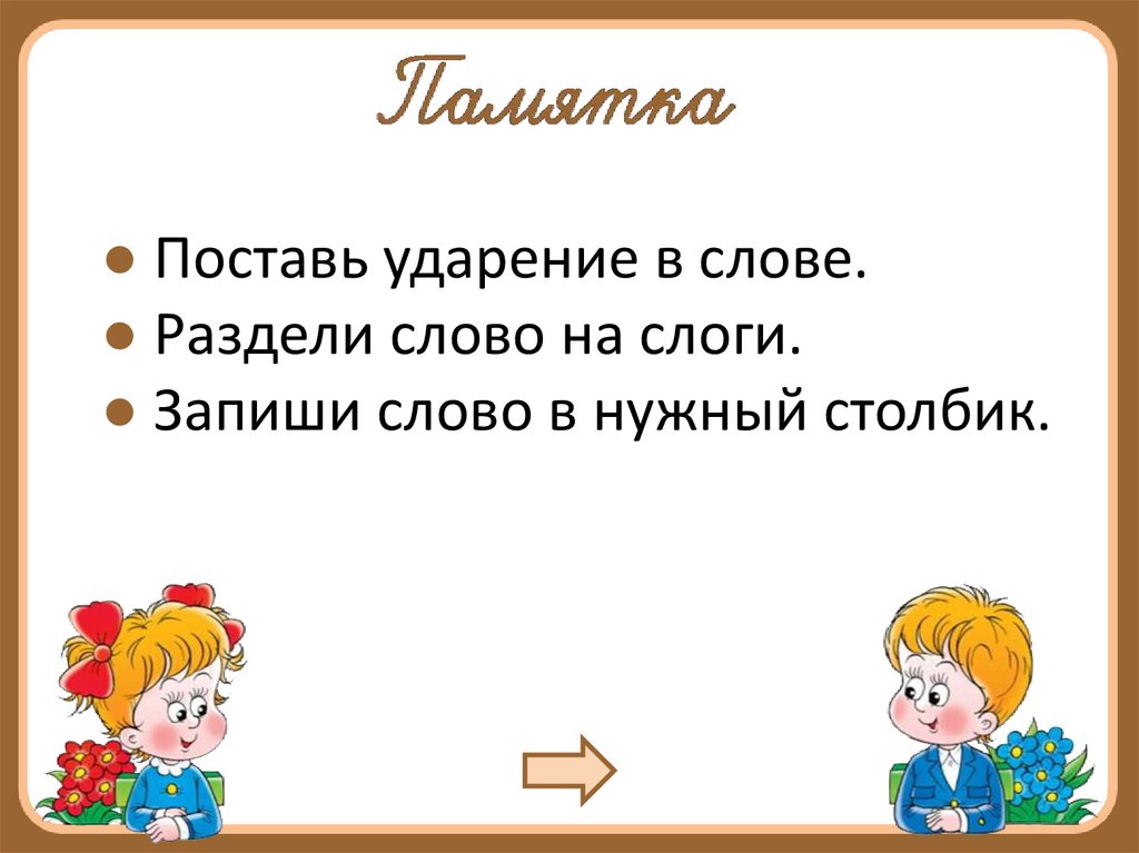 ● Поставь ударение в слове.● Раздели слово на слоги.