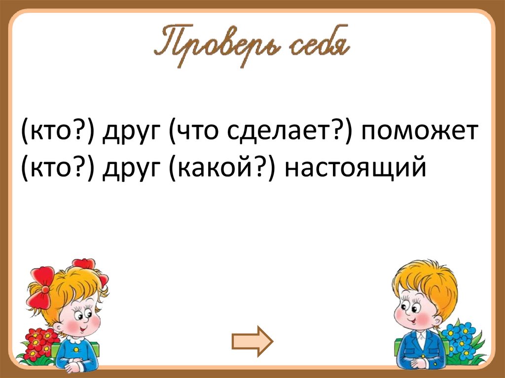 (кто?) друг (что сделает?) поможет(кто?) друг (какой?) настоящий