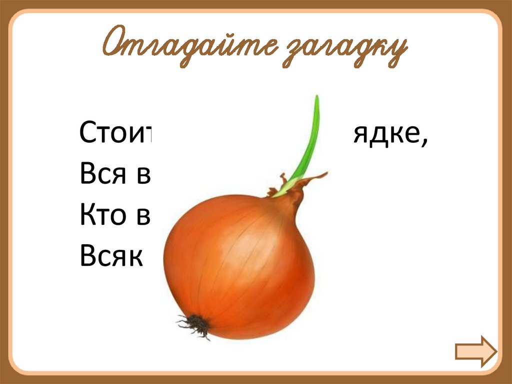 Стоит девица на грядке,Вся в заплатках,