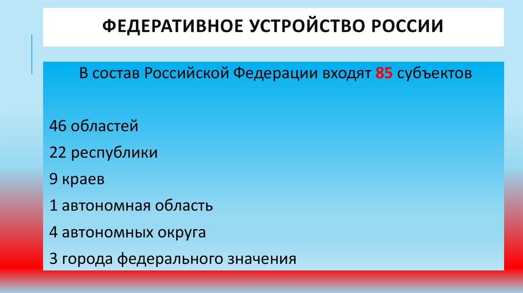 ФЕДЕРАТИВНОЕ УСТРОЙСТВО РОССИИВ состав Российской Федерации входят 85 субъектов