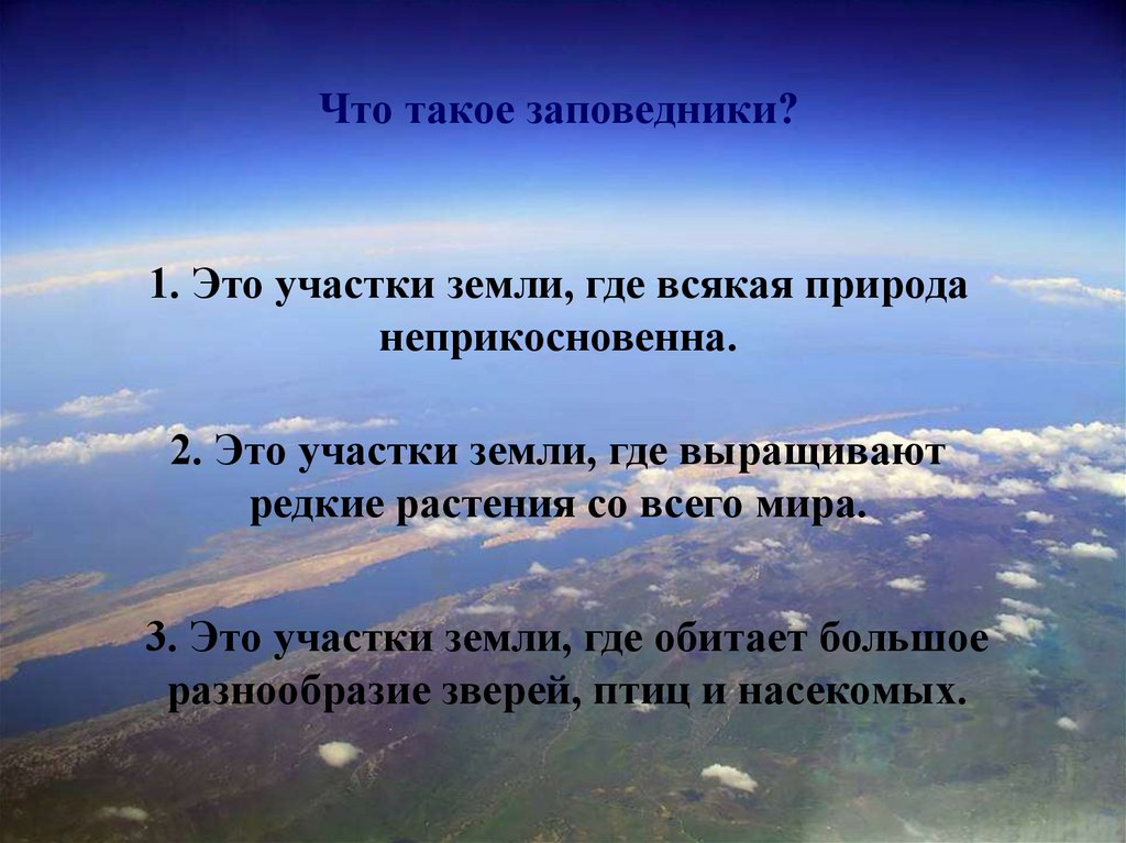 Что такое заповедники?1. Это участки земли, где всякая природа