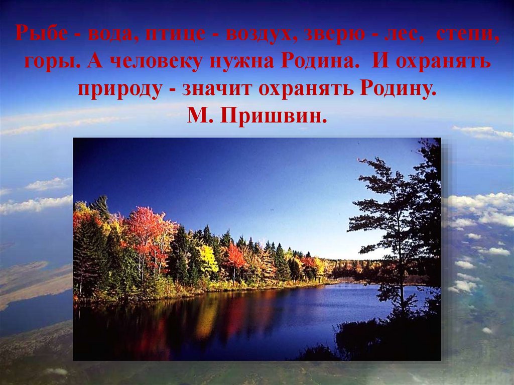 Рыбе - вода, птице - воздух, зверю - лес, степи,горы. А человеку нужна Родина. И охранять