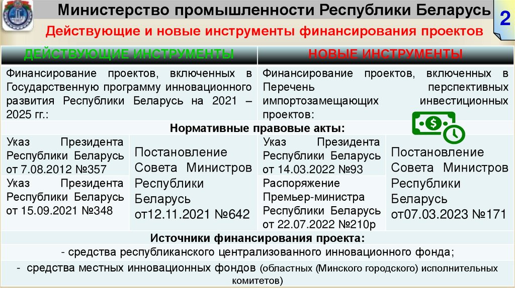 Министерство промышленности Республики БеларусьДействующие и новые инструменты финансирования проектов