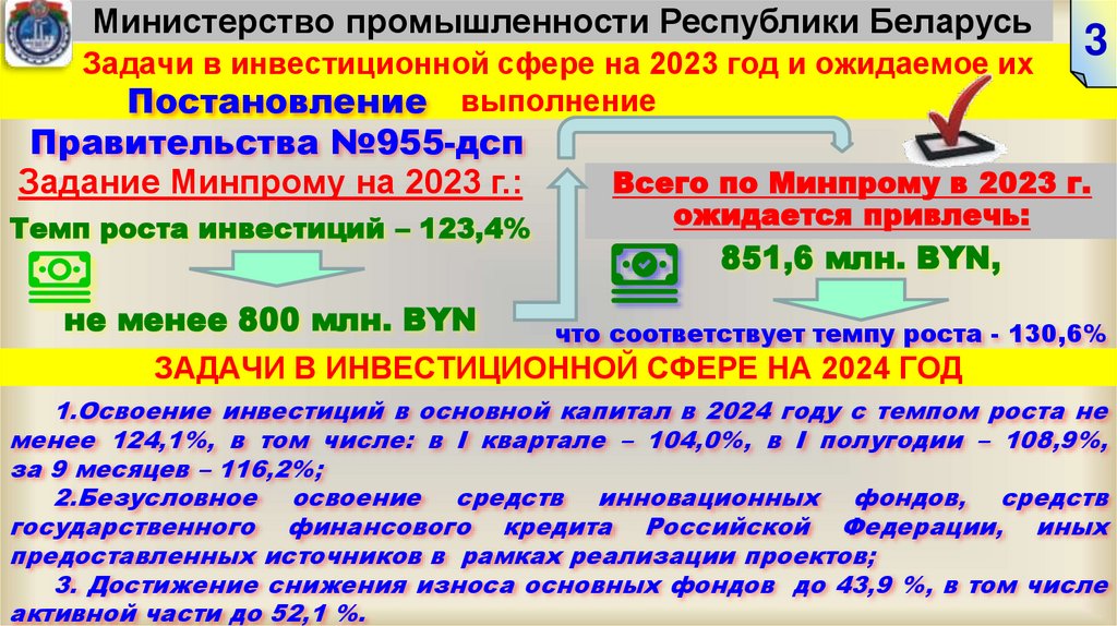 Министерство промышленности Республики БеларусьЗадачи в инвестиционной сфере на 2023 год и ожидаемое их