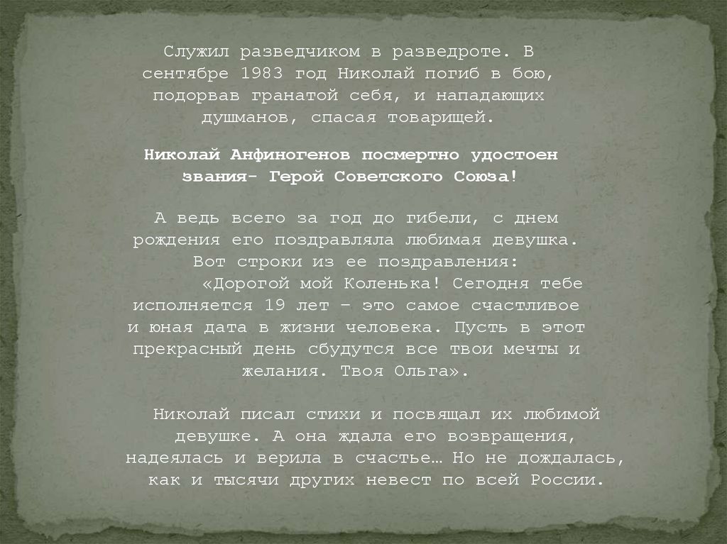 Служил разведчиком в разведроте. Всентябре 1983 год Николай погиб в бою,