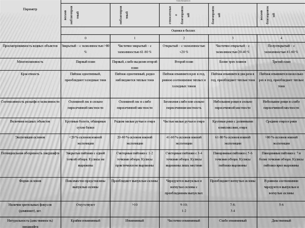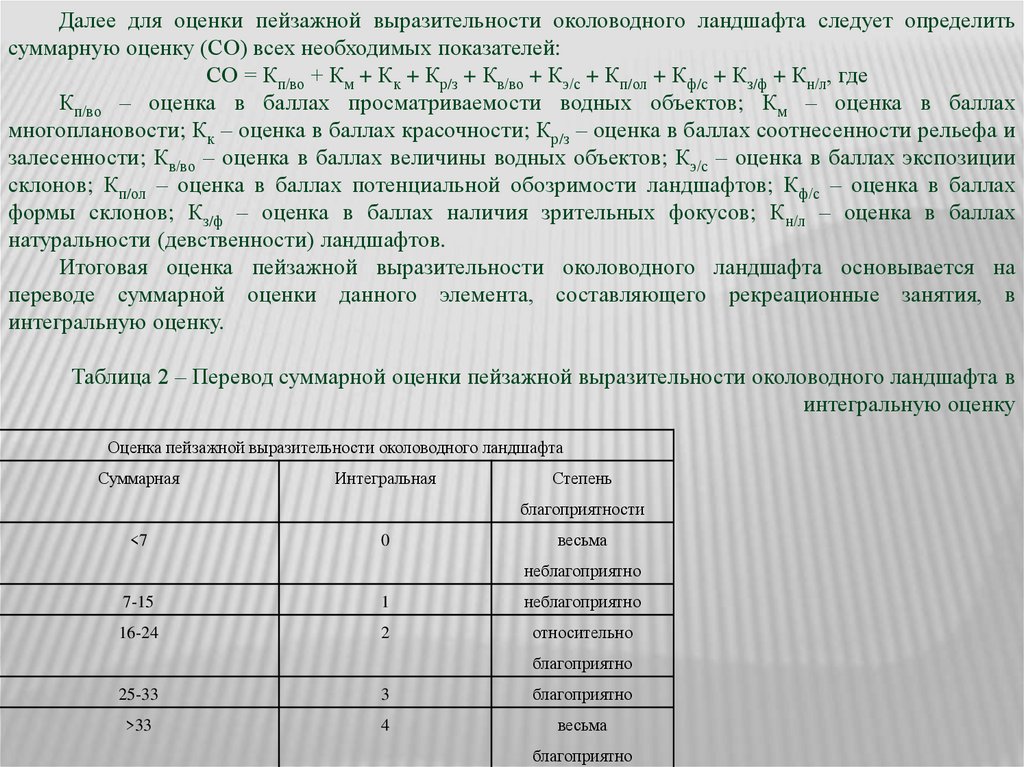 Таблица 2 – Перевод суммарной оценки пейзажной выразительности околоводного ландшафта в