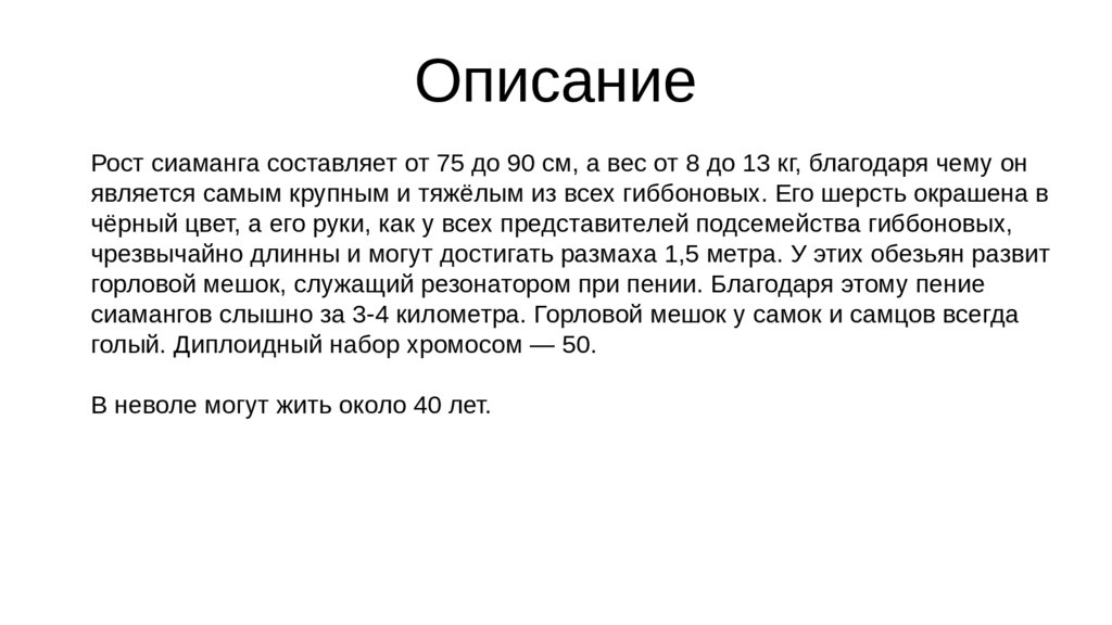 ОписаниеРост сиаманга составляет от 75 до 90 см, а вес от 8 до 13 кг, благодаря чему он